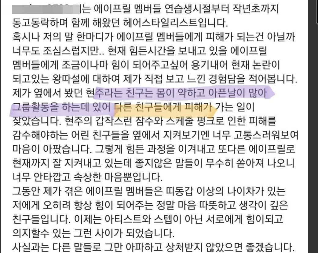 해당 글에는 그룹 에이젝스 멤버 윤영이 왕따 피해자로 지목된 에이프릴 전 멤버 현주를 언급하며 "너 때문에 우리 애들 진짜 불쌍하다"고 올린 장문의 글과 에이프릴 스태프들과 소속사가 "현주라는 친구는 몸이 약하고 아픈 날이 많아서 그룹 활동을 하는 다른 친구들에게 피해를 줬다"며 올린 글들이 올라왔다.