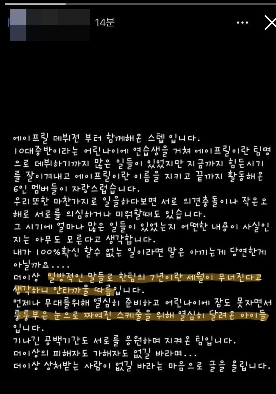 에이프릴 스태프들이 올린 반박글에 네티즌들 '서운'