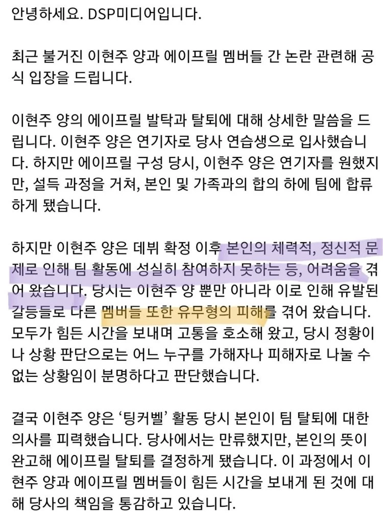 한편 DSP 엔터테인먼트 측은 '에이프릴' 왕따 논란에 대해 "이현주는 데뷔 확정 이후 본인의 체력적, 정신적 문제로 팀 활동에 성실히 참여하지 못하는 등 어려움을 겪었다. 이로 인해 유발된 갈등으로 다른 멤버들도 피해를 봤다. 이현주가 원했던 활동에 관해선 팀 탈퇴 후에도 가능한 모든 지원을 했다"고 말했다