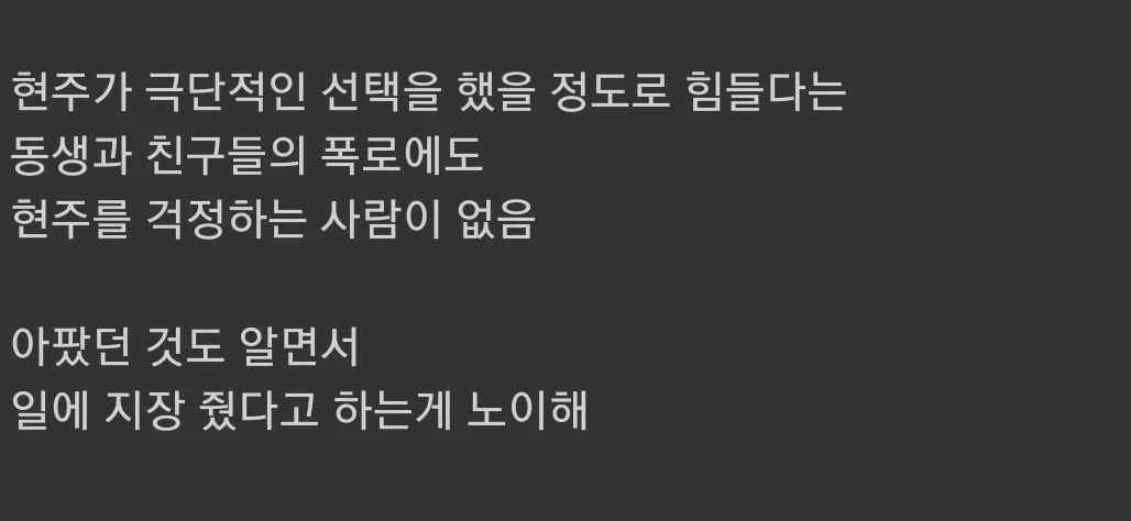 글쓴이는 "현주가 극단적인 선택을 했을 정도로 힘들다는 친구들과 동생의 폭로에도 현주를 걱정하는 사람이 없다. 아팠던 것도 알면서 일에 지장을 줬다고 하는 것도 이해가 안 된다"고 지적했다.