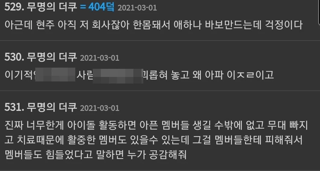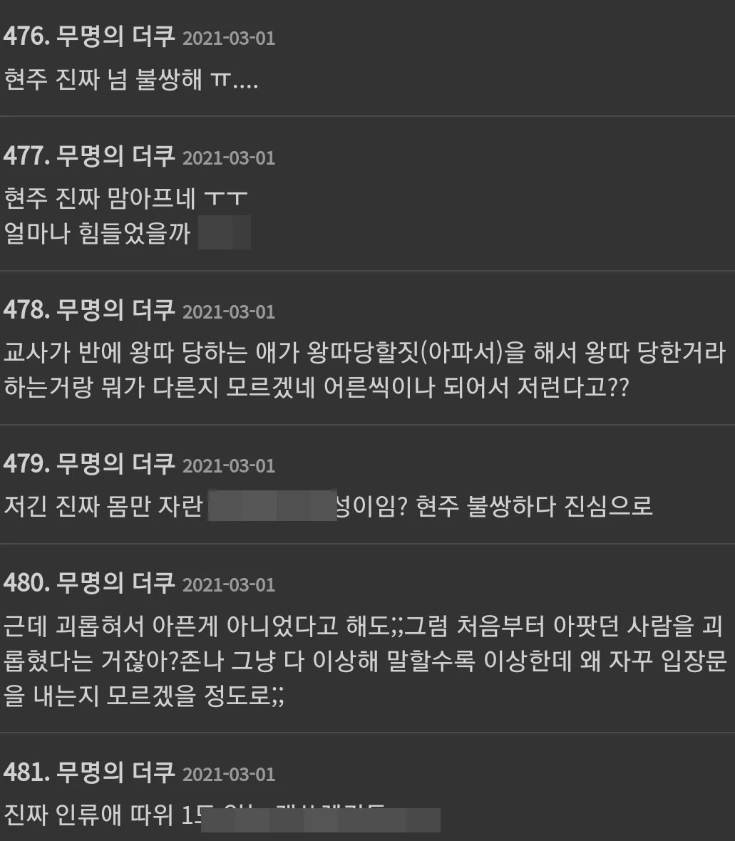 해당 글을 읽은 다른 네티즌들도 "진짜 이기적이다", "진짜 너무한 게 아이돌 활동하면 아픈 멤버들이 생길 수밖에 없는데 그걸 멤버들한테 패해줬다고 하는 거다", "현주 아직 저 회산데 다 같이 바보로 만들어서 걱정된다", "현주 너무 불쌍하다", "교사가 반에 왕따 당하는 얘가 그럴만했다고 하는 거랑 다를 게 없다", "괴롭혀서 아픈 게 아니었다고 해도 처음부터 아팠던 사람을 괴롭혔다는 거 아니냐"며 의견을 남겼다.
