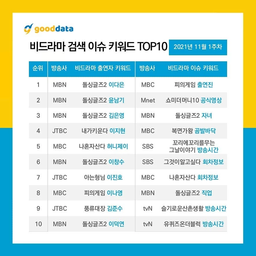 '돌싱글즈2' 출연자 이다은, 윤남기, 김은영, 이창수, 이덕연 등은 이날 발표된 '비드라마 검색 이슈 키워드 톱 10'에 이름을 올리기도 했다.