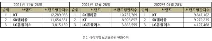 한국기업평판연구소가 28일 발표한 내용에 따르면 통신 상장기업 브랜드평판 2022년 1월 빅데이터 분석결과, 1위 KT-2위 SK텔레콤-3위 LG유플러스 순으로 나타났다.
