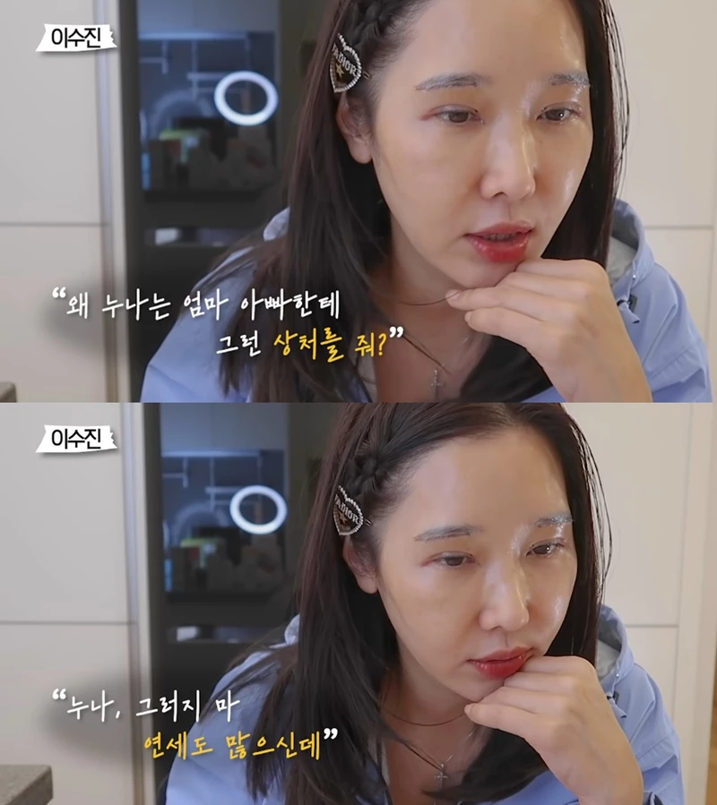 "정말 어머니가 호적에서 팠냐"는 구독자의 질문에 이수진은 "이번에 (호적에서) 팠다고 한다. 엄마하고는 원래 사이가 그랬으니까. 호적을 파든 말든. 굳이 알아보러 갈 시간도 없다"며 "시간도 아깝다. 원래 슬픈 인생이었다. 엄마보다 모카(반려묘)가 좋냐고? 당연하다. 이상한 엄만데"라고 담담히 토로했다.