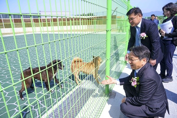 [위키트리 광주전남취재본부 노해섭 기자] 강기정 광주광역시장이 24일 오전 북구 본촌동에 들어선 '광주시 동물보호센터 개소식'에 참석해 센터에서 돌보고 있는 유기견을 살펴보고 있다./광주광역시 제공