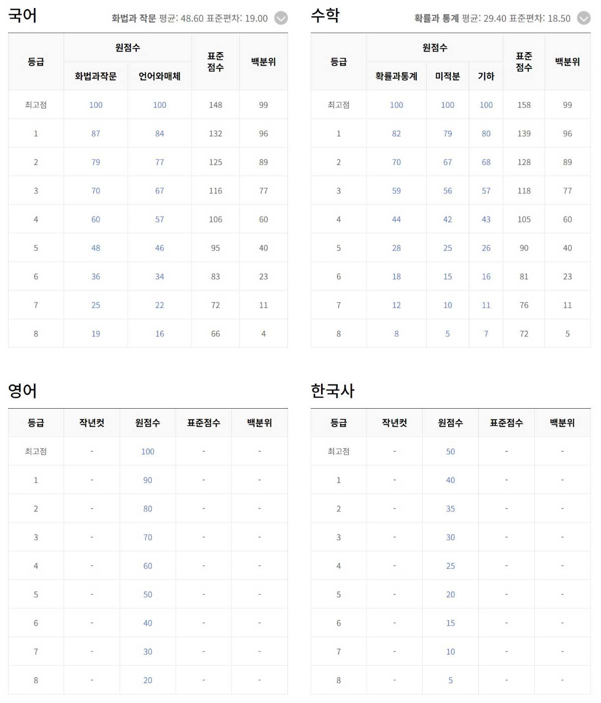 - 수학 1등급 139점, 2등급 128점, 3등급 118점, 4등급 105점, 5등급 90점, 6등급 81점, 7등급 76점, 8등급 72점. (확률과 통계 평균: 29.40 표준편차: 18.50) / (미적분 평균: 50.60 표준편차: 21.60) / (기하 평균: 33.20 표준편차: 21.40)