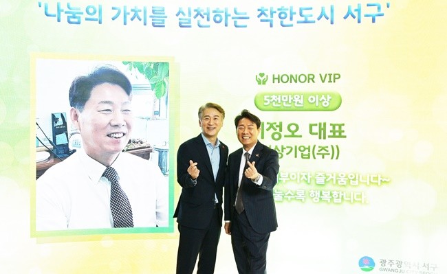 이날 광주사회복지공동모금회(사랑의열매) 후원자 그룹인 ‘서구 아너스’ 회원가입식도 진행됐다. 정상기업(주) 이정오 대표는 5년 이내 5000만원 기부를 약정하는 ‘서구 아너 브이아이피(HONOR VIP)’에 가입했다.