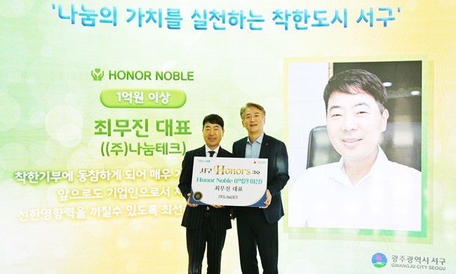 또 ㈜나눔테크 최무진 대표는 ‘서구 아너 노블(HONOR NOBLE)’로 가입해 5년 이내 1억원 기부를 약정했으며, VIP1급자동차정비마을 김훈중 대표도 ‘서구 아너(HONOR)’로 회원 가입해 5년 이내에 3000만원의 기부를 약정했다.