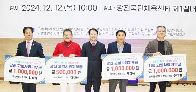 특히 이날 행사에는 강진을 사랑하고 응원하는 마음을 모아 유태경 이통장연합회 영암군 지회장, 김상현 광성타올나라 대표, 서경옥 목포한국뷔페 대표가 각 100만원, 김길남 삼성기술(주) 대표가 50만원의 고향사랑기부금을 기부해 의미를 더했다.