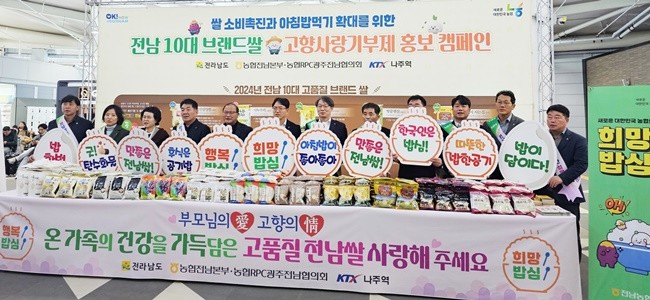 [위키트리 광주전남취재본부 노해섭 기자]전라남도(도지사 김영록)는 24일 나주역에서 설 명절 맞이 농협전남지역본부, 광주·전남 RPC협의회와 함께 귀성·귀경객을 대상으로 전남 10대 브랜드 쌀과 아침밥 먹기 홍보를 추진했다.