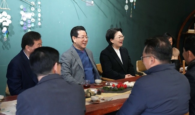 김영록 전라남도지사가 30일 구례군 광의면 ‘천 개의 향나무 숲’ 정원을 방문, 정원관계자와 차담을 나누고 있다.