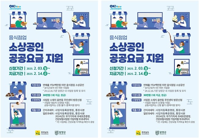 지원 대상은 2024년 12월 16일 기준 담양군 내 사업장 등록·유지 중인 음식점업 소상공인으로, 상시 근로자 5인 미만, 연매출 1억 4백만 원 미만(간이과세자 기준)인 업체다.