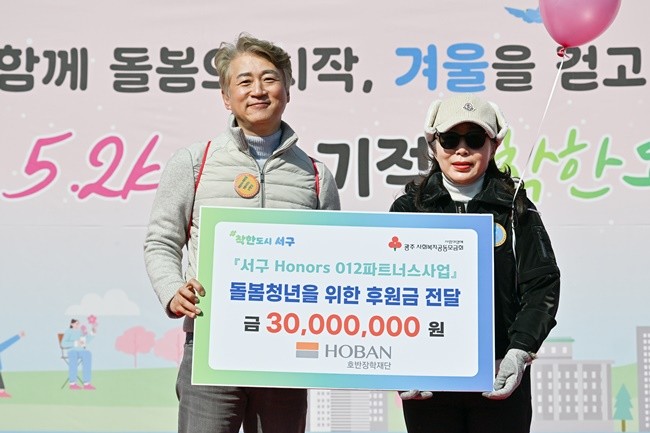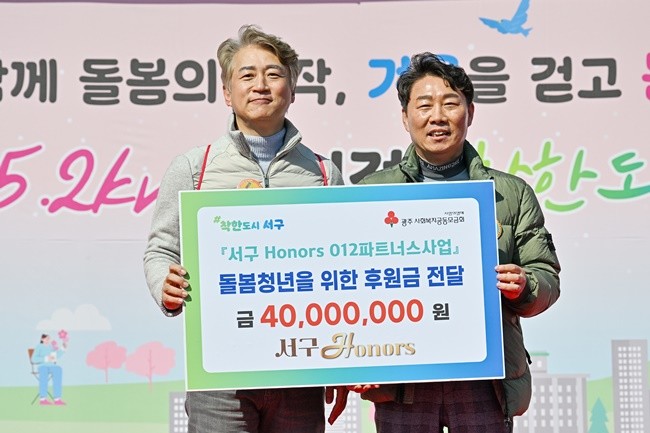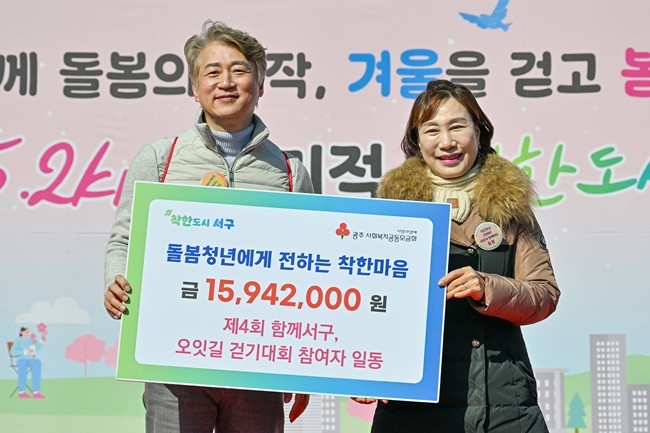 김이강 광주 서구청장이 22일 서구 동천교 하부 일대에서 열린 ‘제4회 함께서구, 오~잇길 걷기대회’에서 후원금 전달식을 갖고 있다./광주 서구 제공