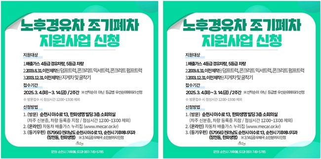 [위키트리 광주전남취재본부 노해섭 기자] 순천시(시장 노관규)는 미세먼지 및 온실가스 저감을 위한 2025년 조기폐차 지원사업을 오는 3월 4일부터 3월 14일까지 접수한다고 밝혔다.