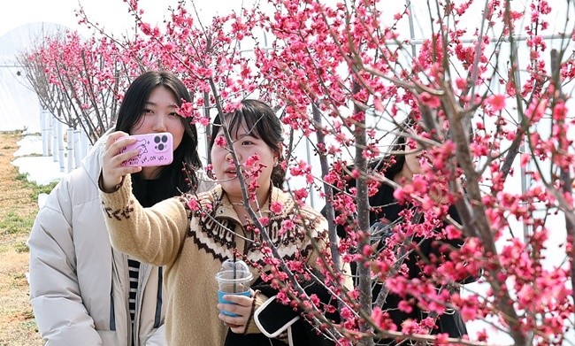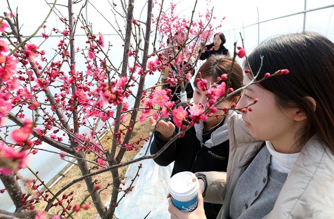 제53회 강진청자축제가 열리고 있는 전남 강진군 대구면 청자촌 일원. 축제장 남문 입구에 조성된 매화 밭에 활짝 핀 홍매화가 관광객의 발길을 사로잡고 있다.