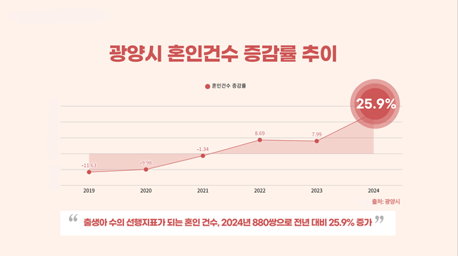 이러한 상황에서 2024년 광양시의 출생아 수는 941명으로 2023년 대비 109명(13.1%)이 증가하였고, 출생아 수의 선행지표가 되는 혼인 건수 또한 2024년 880쌍으로 전년 대비 25.9%가 증가했다.