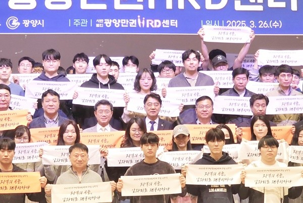 [위키트리 광주전남취재본부 노해섭 기자] 전남도의회 김태균 의장은 3월 26일 오후 2시 광양커뮤니티센터 1층 다목적 홀에서 개최된 ‘2025년 광양만권HRD센터 통합 입학식’에 참석해 축하와 함께 “취업 성공을 위한 원스톱 지원공간이 되어 줄 것”을 당부했다.