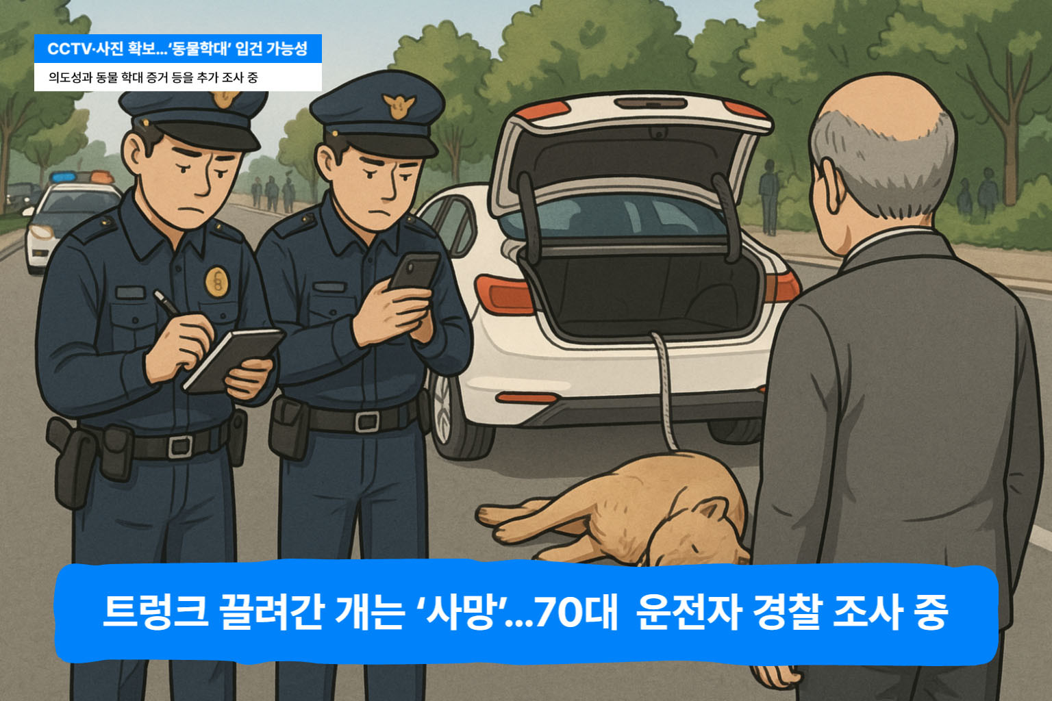 지난 6일 대낮, 충남 당진 도로 위를 주행하던 차량 뒤편에 축 늘어진 대형견 한 마리가 질질 끌려갔다. 목격자의 신고로 현장에 출동한 경찰은 차량 트렁크에 매달린 개가 이미 숨진 상태였다는 사실을 확인하고, 70대 남성 운전자에 대해 동물 학대 혐의로 입건 전 조사 중이다.