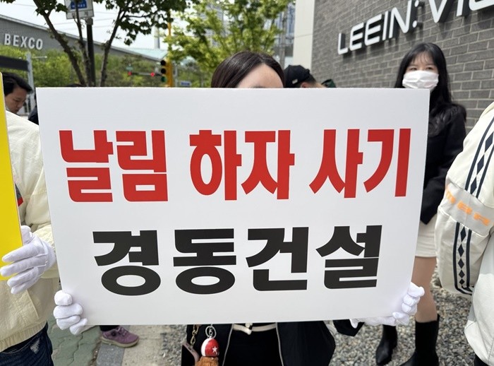 25일 오전 경동리인뷰2차 입주자(입주자대표회의 회장 송 옥주) 81명은 해운대구 우동 1118-5 경동리인뷰 모델하우스 정문에서 '귀 틀막 경동건설 이러고도 3차 분양 엉망진창 하자대응 개판오분 공용시설' 현수막을 앞세우고, 날림 하자 사기 경동건설, 부산시민 뒷통수 치는 경동건설, 준공나면 나몰라라 경동건설, 약속한 업그레이드 지금당장 시행하라 경동건설, 경동회장은 입주민과 소통하라 등 플래카드를 들고 모델하우스를 찿는 시민들에게 부실시공을 호소했다.
