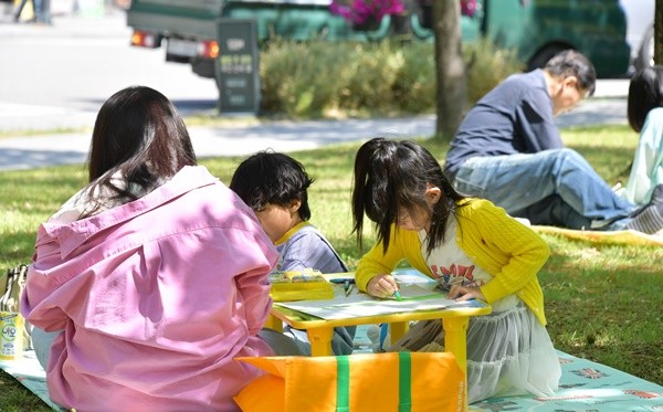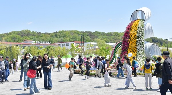 죽녹원 관광정보센터 앞 광장에는 메인 조형물인 '꽃탑'이 설치돼 관람객들의 이목을 끌었으며, 잔디밭에서는 어린이들이 그림을 그리고 부모들이 함께 시간을 보내는 평화로운 모습이 연출됐다.