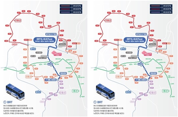 광주시는 이번 용역을 통해 ‘제1차 간선급행버스체계(BRT) 종합계획 수정계획(2021~2030)’에 반영된 광주 백운광장(옛 대동고)~농성역~광천사거리~경신여고~광주공고(8.67㎞)를 잇는 ‘백운-매곡 BRT’ 노선의 개발계획 수립뿐만 아니라 신규 노선 발굴까지 진행할 예정이다. 2026년 기본 및 실시설계, 2027년 개통을 목표로 추진하고 있다.