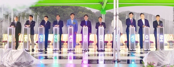 ‘개막 퍼포먼스’ 순서에서는 무대에 오른 내빈들이 동시에 점등 버튼을 눌러 ‘봄꽃 향연 설렘의 장성으로’라는 주제 문구를 전광판에 표출시켰다.