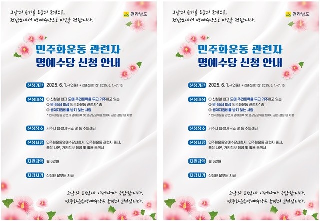 심재명 전남도 자치행정과장은 “민주화운동명예수당은 민주주의와 인권을 위해 헌신한 분들의 용기에 대한 감사와 존경의 상징”이라며 “늦었지만 꼭 필요한 예우인 만큼 대상자들께서 빠짐없이 신청하길 바란다”고 당부했다.