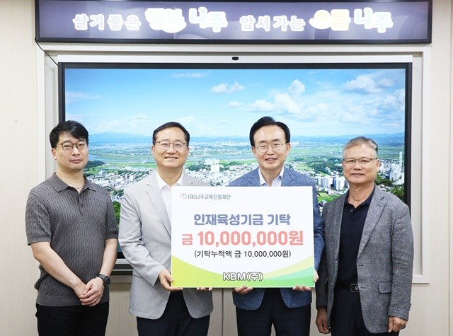 [위키트리 광주전남취재본부 노해섭 기자] (재)나주교육진흥재단(이사장 윤병태)은 전라남도 나주시에 소재한 (주)대신육가공(대표 조개동)과 케이비엠(주)(대표 유병일)에서 나주지역 인재육성기금으로 각각 1천만 원씩 총 2천만 원을 기탁했다고 12일 밝혔다.