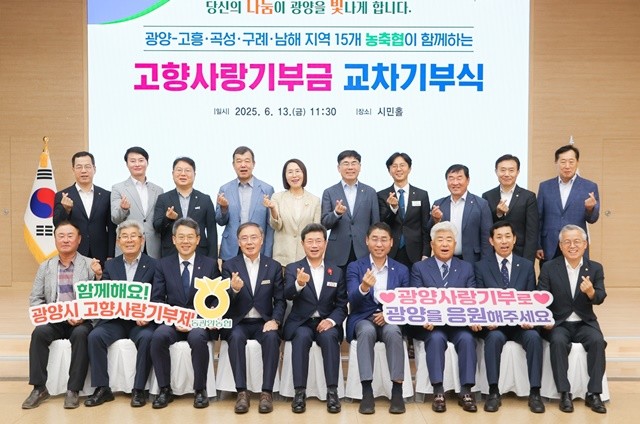 이번 교차 기부는 광양시 농협 7개소와 고흥·곡성·구례·남해 지역 농축협 8개소 임직원이 참여해 총 6천만 원 규모의 고향사랑 기부금을 상호 기부하는 방식으로 진행됐다.