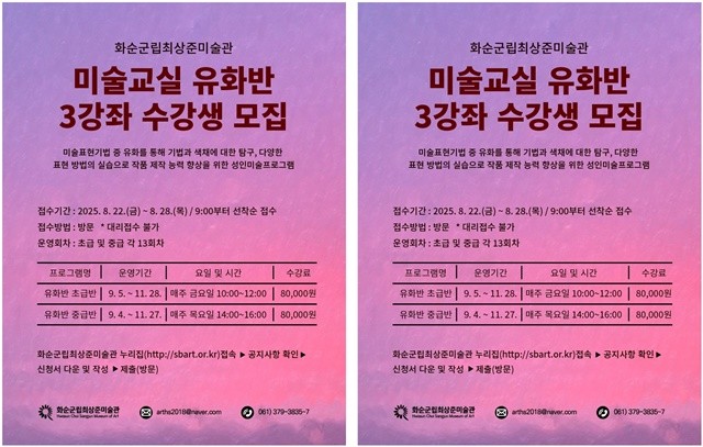 신청서는 화순군립최상준미술관 누리집에서 내려받아, 8월 22일 오전 9시부터 미술관 방문 접수(선착순)로 이뤄진다.