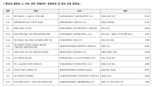 매 강의 후에는 영화 무료 상영까지 이어지며, 라틴 아메리카에 대한 이해와 현장감을 더욱 풍성하게 채워준다.