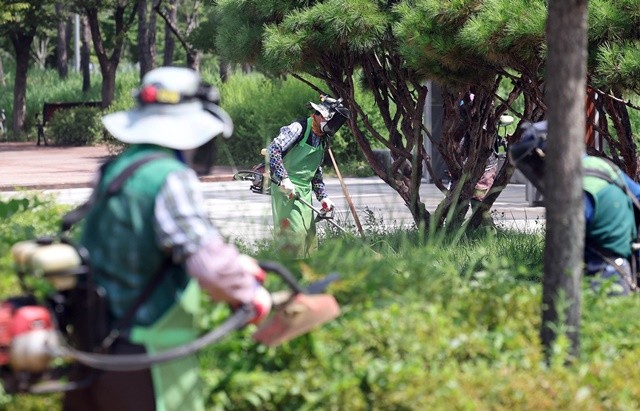 [위키트리 광주전남취재본부 노해섭 기자]25일 광주시 북구 신용근린공원에서 북구청 공원녹지과 공원관리팀 직원들이 각종 병해충 예방과 쾌적한 공원 환경 조성을 위해 예초작업을 실시 하고 있다.