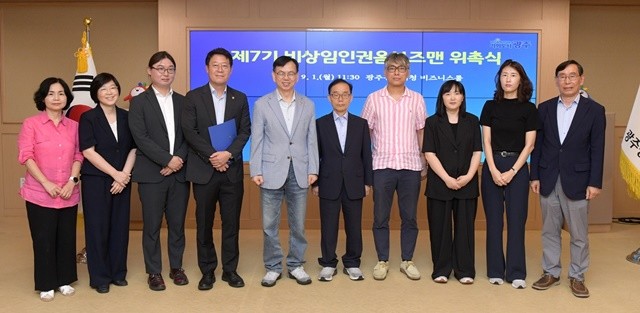[위키트리 광주전남취재본부 노해섭 기자]고광완 광주광역시 행정부시장이 1일 오전 시청 비즈니스룸에서 제7기 비상임인권옴부즈맨 위촉식에서 위촉장을 수여한 후 기념촬영을 하고 있다. /광주광역시 제공