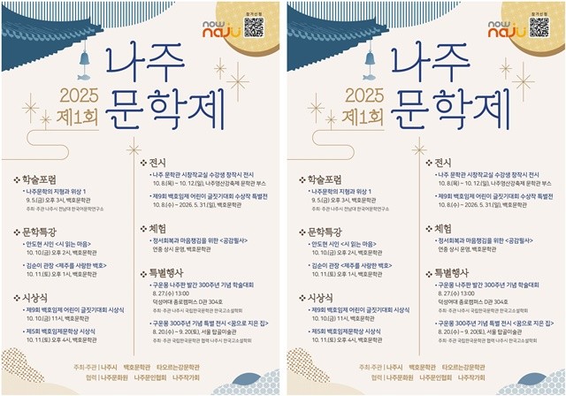 [위키트리 광주전남취재본부 노해섭 기자]전남 나주시가 문학 진흥과 관광 활성화를 위해 오는 9월부터 10월까지 제1회 나주문학제를 개최하고 학술포럼과 특강, 문학상 시상식, 전시 등 다채로운 프로그램으로 나주문학의 위상과 가치를 널리 알린다.