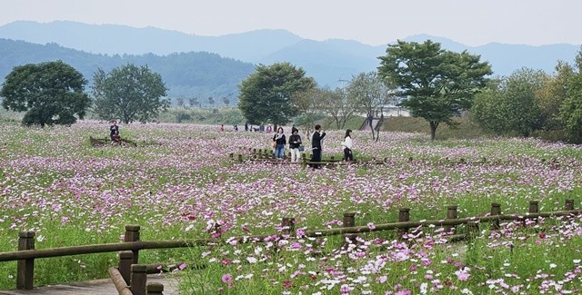올해 코스모스 꽃밭은 기존 1만7천㎡에서 5만7천㎡로 대폭 확대됐다. 마을 이장단과 부녀회, 여성단체협의회 등 주민들이 힘을 모아 잡초 제거, 꽃씨 파종, 관수시설 설치 등 꾸준한 관리 작업을 이어온 덕분에 더욱 풍성한 꽃밭이 조성됐다.