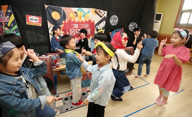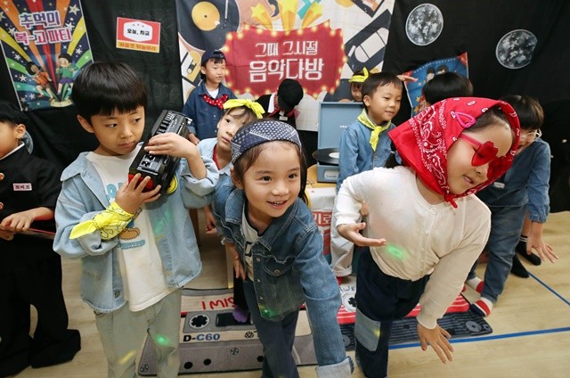 [위키트리 광주전남취재본부 노해섭 기자]1일 광주시 북구청 어린이집에서 아이들이 ‘복고 데이’ 7080세대 복장과 분장을 하고 당시 다방 문화를 연출하며 즐거운 시간을 보내고 있다.