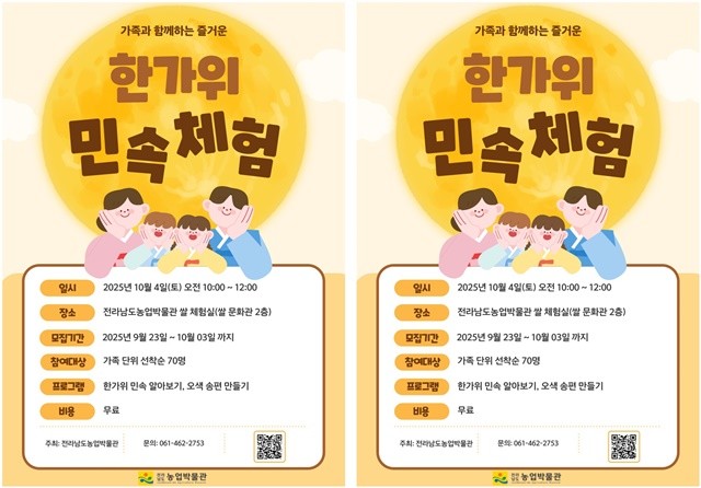 ‘한가위 민속 체험행사’는 가족 단위로 선착순 70명을 모집한다. 참가 신청은 농업박물관 누리집에서 10월 3일까지 접수하며, 참가비는 무료다.