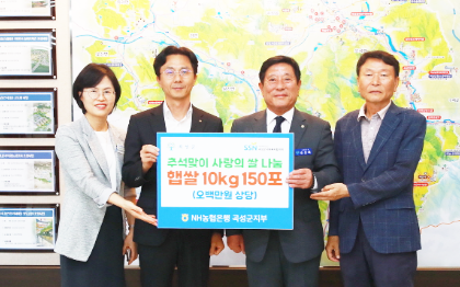 [위키트리 광주전남취재본부 노해섭 기자]곡성군은 지난 9월 30일 NH농협은행 곡성군지부(지부장 방현용)에서 추석 명절을 맞아 곡성군사회복지협의회(대표이사 신봉균)에 햅쌀(10kg) 150포, 약 500만 원 상당을 기탁했다고 1일 전했다.