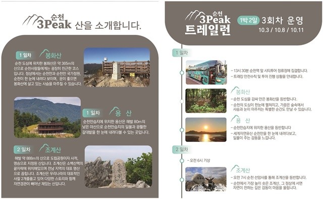 주요 일정은 ▲봉화산 정상에서 내려다보는 순천 도심의 전경 ▲순천만 용산에서 감상하는 세계자연유산의 황홀한 일몰 ▲선암사를 품은 조계산의 고즈넉한 풍광 체험 등으로 구성됐으며, 추석 연휴인 10월 3~4일, 8~9일, 11~12일 총 3회 운영된다.