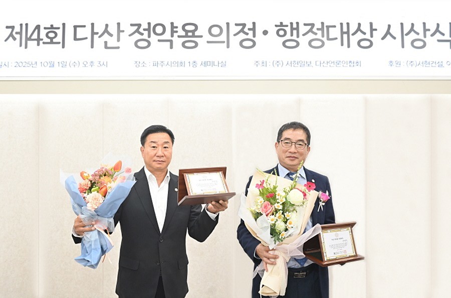 파주시의회 박대성 의장, 손형배 의원은 지난 1일 파주시의회에서 열린 제4회 다산 정약용 의정·행정대상에 기초의원 부문 대상을 수상하였다.