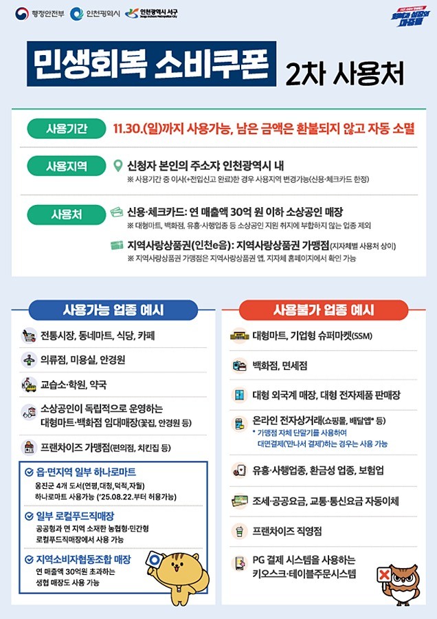민생쿠폰은 지역사랑상품권(인천e음) 가맹점에서 사용가능하며, 신용·체크카드는 일부 업종을 제외하고 연 매출액이 30억 이하인 음식점, 카페, 동네마트 등 소상공인 매장에서 사용할 수 있다.