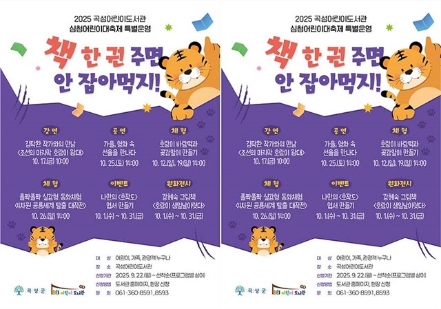 [위키트리 광주전남취재본부 노해섭 기자] 곡성군(군수 조상래)은 다가오는 제25회 곡성심청어린이대축제를 기념하여 10월 한 달간 곡성어린이도서관에서 지역민과 방문객을 위한 다양한 볼거리와 독서문화 프로그램을 운영한다고 2일 밝혔다.