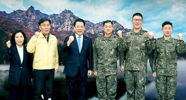 [위키트리 광주전남취재본부 노해섭 기자]김영록 전라남도지사가 2일 전남도청을 내방한 이일용 제31보병사단장과 면담을 마치고 기념촬영을 하고 있다.