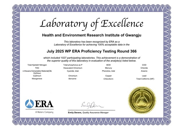 [위키트리 광주전남취재본부 노해섭 기자]광주광역시 보건환경연구원이 국립환경과학원 주관 ‘2025년 대기분야 굴뚝먼지 시료채취 숙련도 시험’에서 모두 ‘적합’ 평가를 받았다.