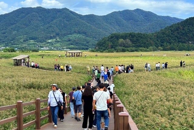 [위키트리 광주전남취재본부 노해섭 기자]추석 연휴 순천만습지를 찾은 방문객들이 가을 정취 속에서 갈대밭 산책을 즐기고 있다.