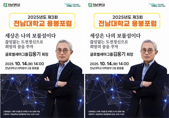 오는 10월 14일 오후 2시, 전남대학교는 국제회의동 용봉홀에서 '2025 제3회 용봉포럼'을 개최하고 김웅기 회장을 연사로 초청한다. 이번 포럼에서 김 회장은 '세상은 나의 보물섬이다 – 끊임없는 도전정신으로 희망의 꿈을 꾸자'라는 주제로 강연에 나설 예정이다.