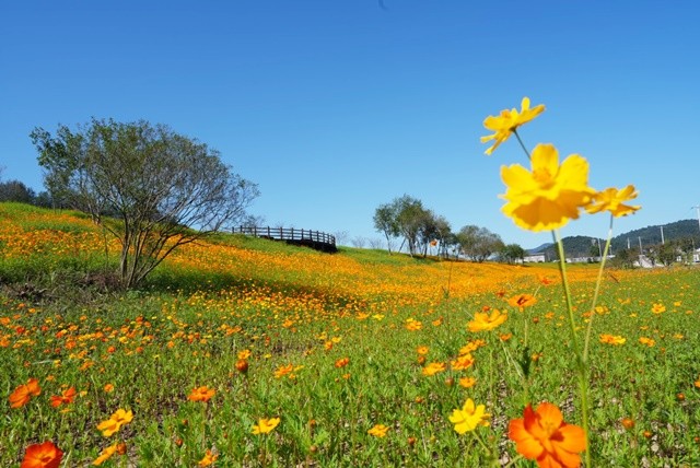 축제가 펼쳐지고 있는 나주시 영산강정원 일원에는 황화 코스모스가 활짝 피어나 노란 물결을 이루며 방문객들의 발길을 붙잡고 있다.