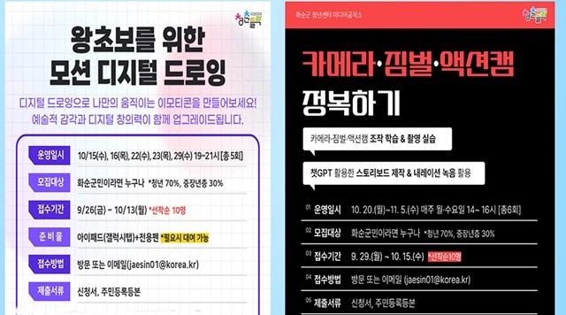 두 교육 모두 화순군민이면 신청할 수 있으며, 모집 인원의 70%는 청년을, 30%는 중장년층을 우선 선발한다. 신청자는 신청서와 주민등록등본을 제출해야 하며, ▲디지털드로잉 과정은 10월 13일까지, ▲영상 실습 과정은 10월 15일까지 청년센터 방문 또는 화순군 청년포털 홈페이지에서 접수가 가능하다.