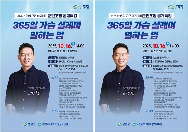 노재영 영암군 인재육성체육과장은 “영암군민이 일상에서 행복과 설렘을 발견하길 바라는 마음으로 이번 특강을 준비했다. 많은 분들이 고명환 작가와 함께 해 삶의 의미를 더 깊게 가꿔보길 바란다”고 전했다.