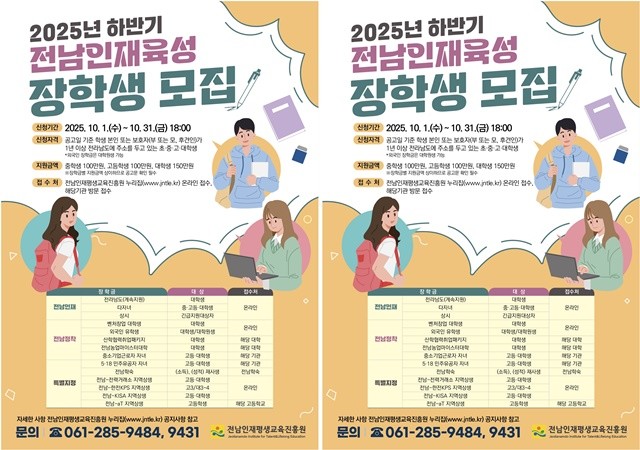 [위키트리 광주전남취재본부 노해섭 기자]전라남도(도지사 김영록)와 전남인재평생교육진흥원은 실질적인 교육기회 보장과 미래인재로의 성장, 지역 정착을 지원하기 위한 2025년 하반기 전남인재육성 장학생을 오는 31일까지 모집한다.